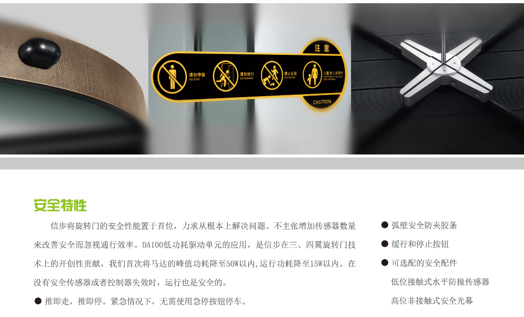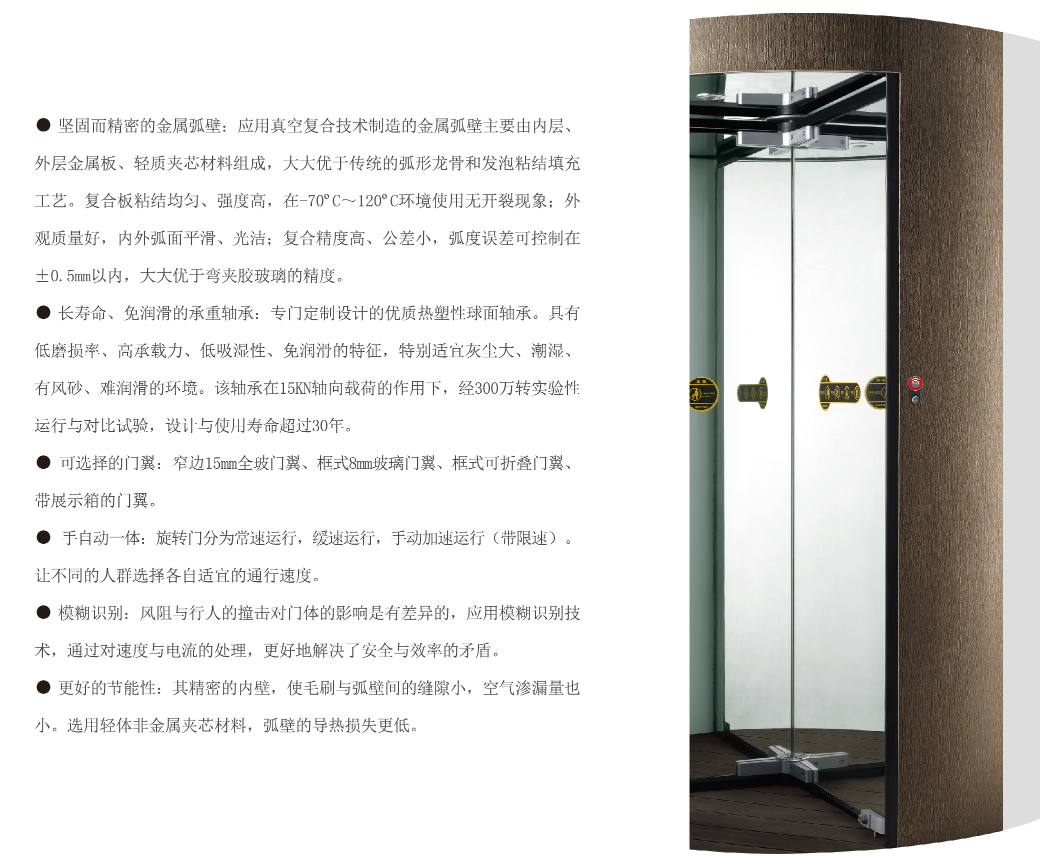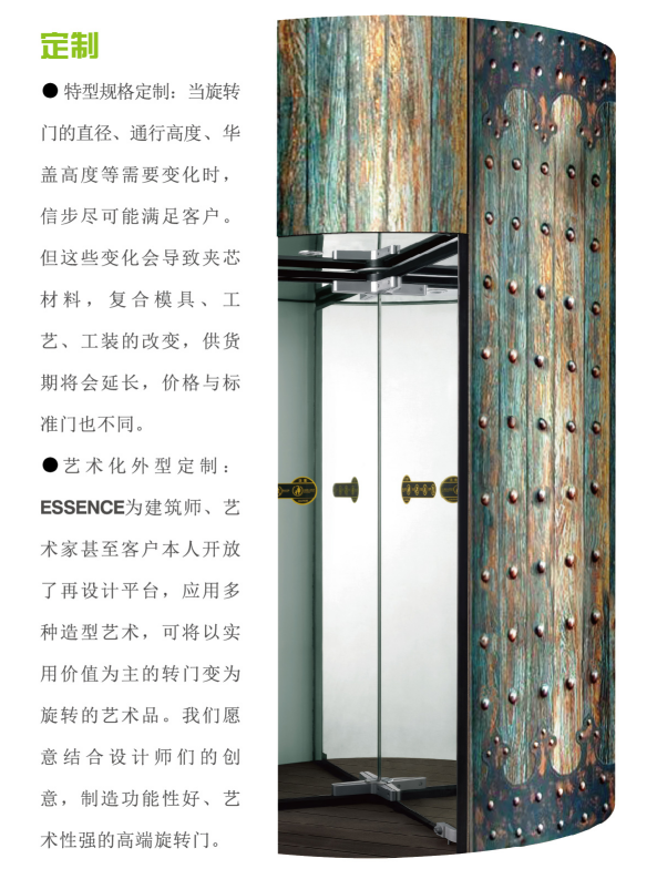 Essence系列旋轉(zhuǎn)門,采用高品質(zhì)的曲面復(fù)合金屬板構(gòu)成旋轉(zhuǎn)門的弧形外壁,形成了極為簡潔的外觀特征。金屬弧壁的多樣性及堅固感,為建筑門區(qū)的設(shè)計提供了極具個性化的解決方案。