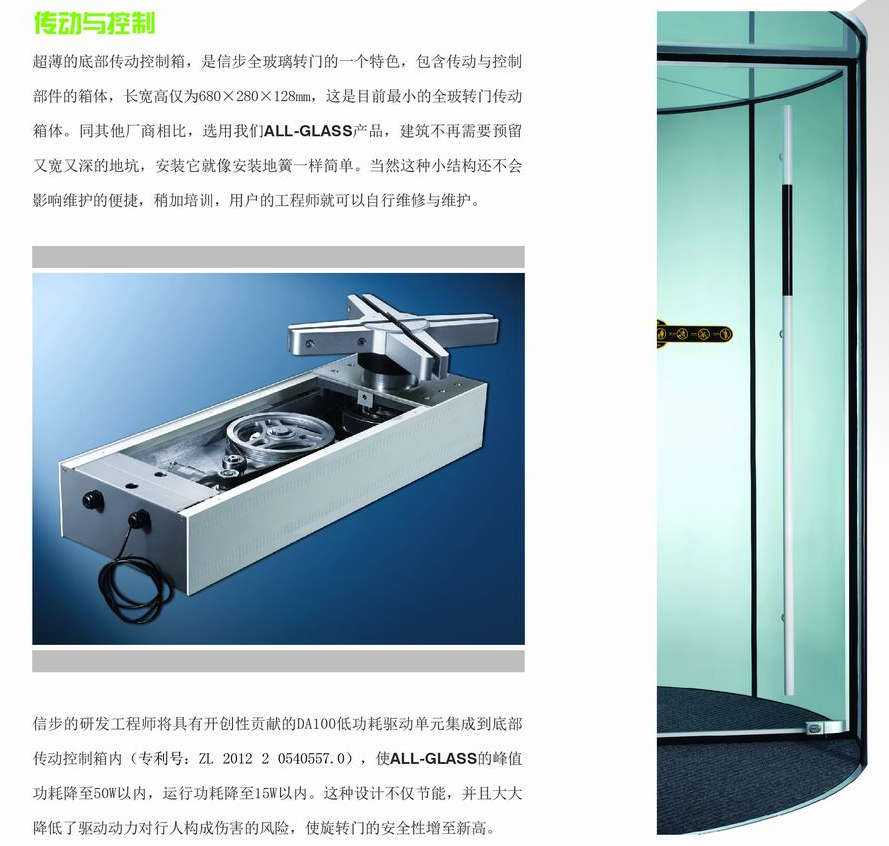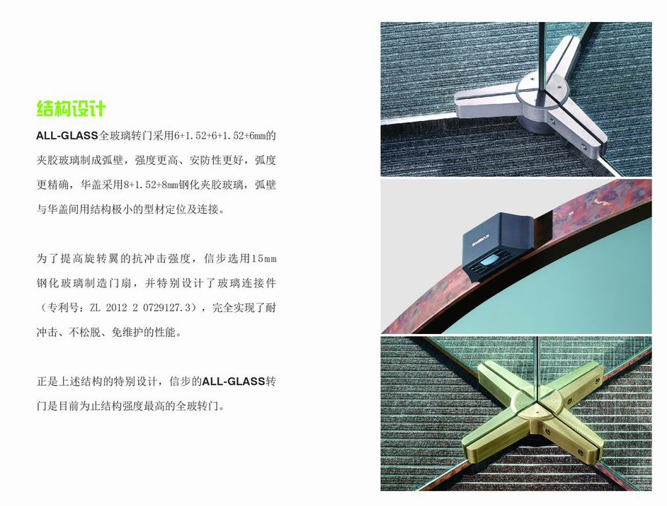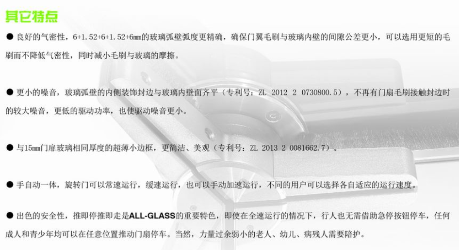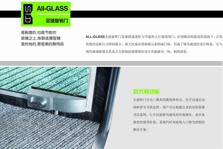 Aglass全玻旋轉(zhuǎn)門是兼顧通透性與節(jié)能的人行通道用門。在保障結(jié)構(gòu)強(qiáng)度的前提下,它將傳統(tǒng)的門扉邊框減至最小,最大化地應(yīng)用玻璃元素構(gòu)成門體,形成了晶瑩剔透的視覺效果,為現(xiàn)代建筑的門區(qū)提供了極為時(shí)尚的解決方案。