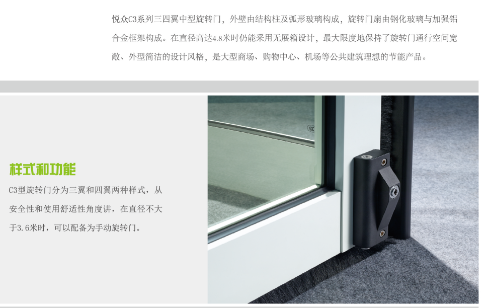 隨著金屬、玻璃等新材料的出現(xiàn),還有現(xiàn)代加工設(shè)備及門體制造工藝的普及,三四翼旋轉(zhuǎn)門產(chǎn)品的種類越來(lái)越多,性能越來(lái)越好,購(gòu)買成本也越來(lái)越低。今天,這類產(chǎn)品已成為許多公共場(chǎng)所的標(biāo)配。
